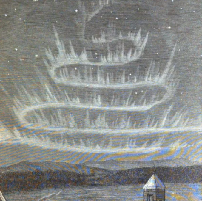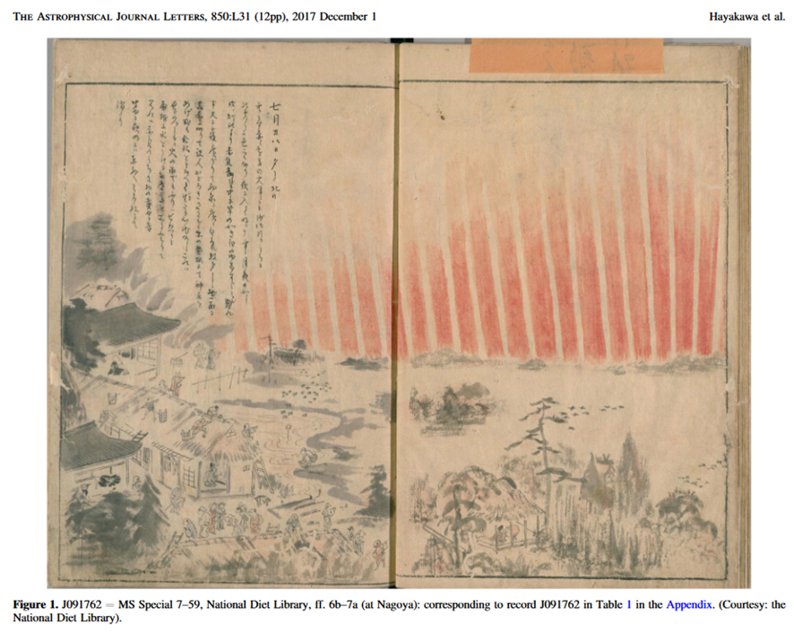 Ilustração japonesa da época mostrando as auroras avermelhadas e incomuns que iluminaram o céu durante o Evento Carrington. Crédito: Cornell University Library.